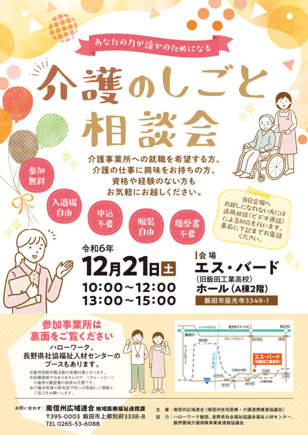 終了しました 当日ご来場の皆様と参加事業所の皆様に感謝申し上げます。 (ブース訪問者:延べ44人) 次回は令和7年度春に開催予定です。 介護事業所への就職を希望する方及び介護の仕事に興味をお持ちの方が、介護事業所とのマッ…